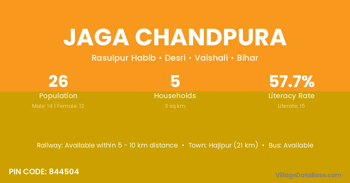 Hajipur (21 km) is the nearest town to Jaga Chandpura village for major economic activities and is located approximately 21 km away.