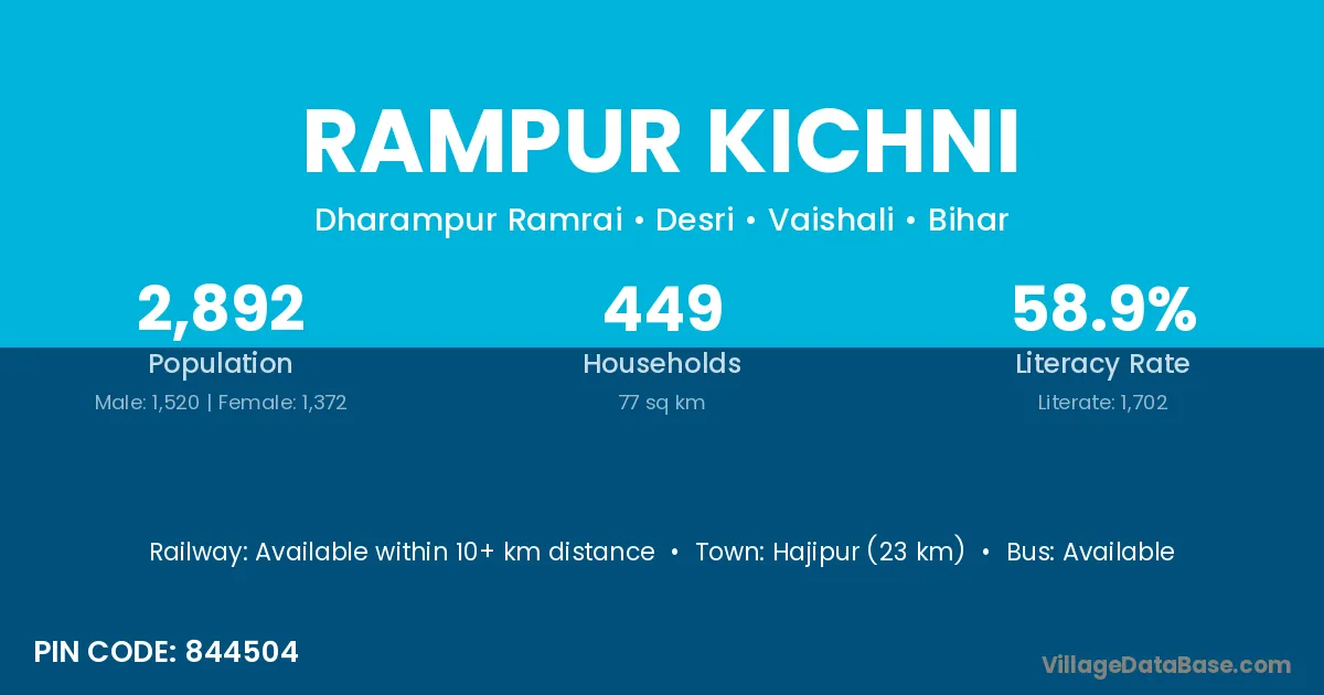 Hajipur (23 km) is the nearest town to Rampur Kichni village for major economic activities and is located approximately 23 km away.