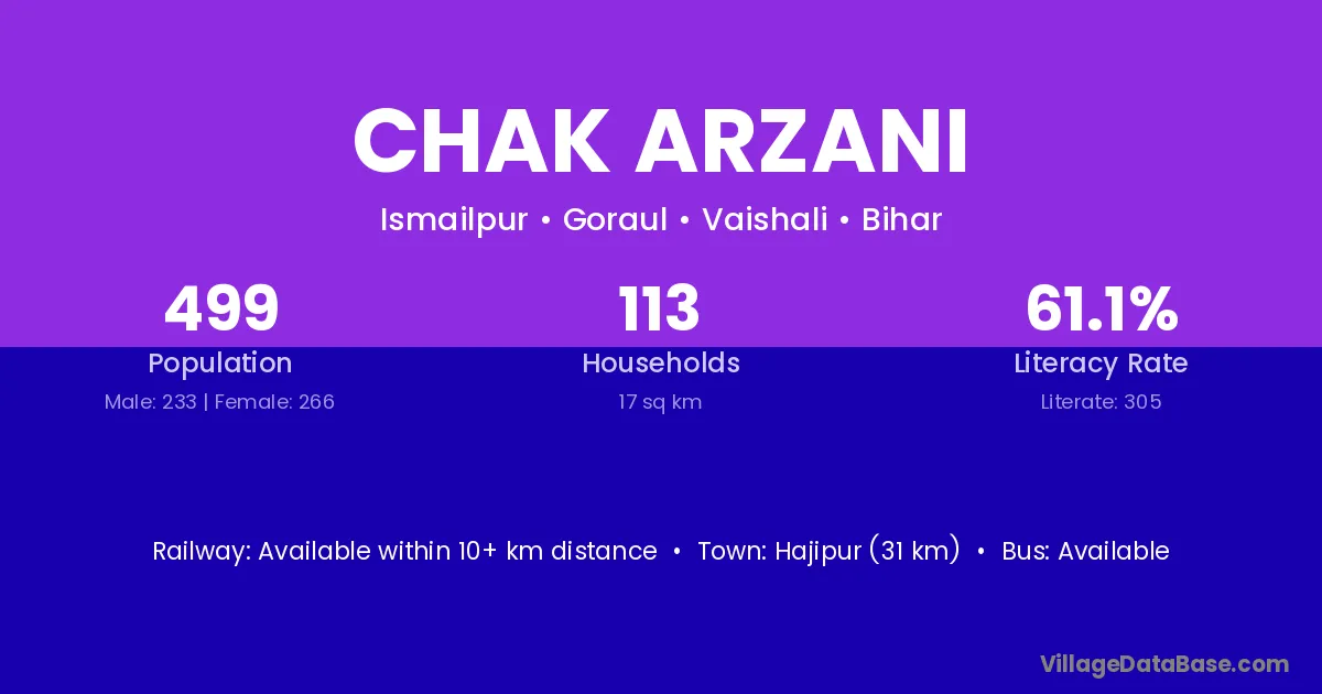 Hajipur (31 km) is the nearest town to Chak Arzani village for major economic activities and is located approximately 31 km away.
