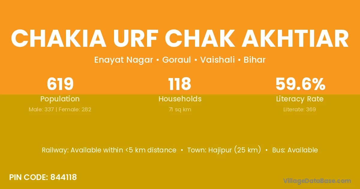 Hajipur (25 km) is the nearest town to Chakia Urf Chak Akhtiar village for major economic activities and is located approximately 25 km away.