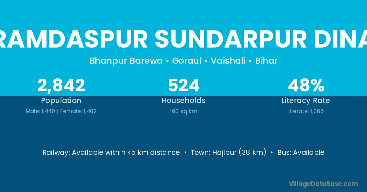 Hajipur (38 km) is the nearest town to Ramdaspur Sundarpur Dina village for major economic activities and is located approximately 38 km away.