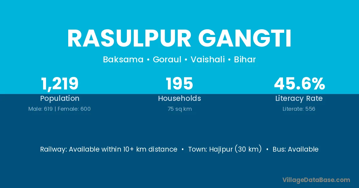 Hajipur (30 km) is the nearest town to Rasulpur Gangti village for major economic activities and is located approximately 30 km away.