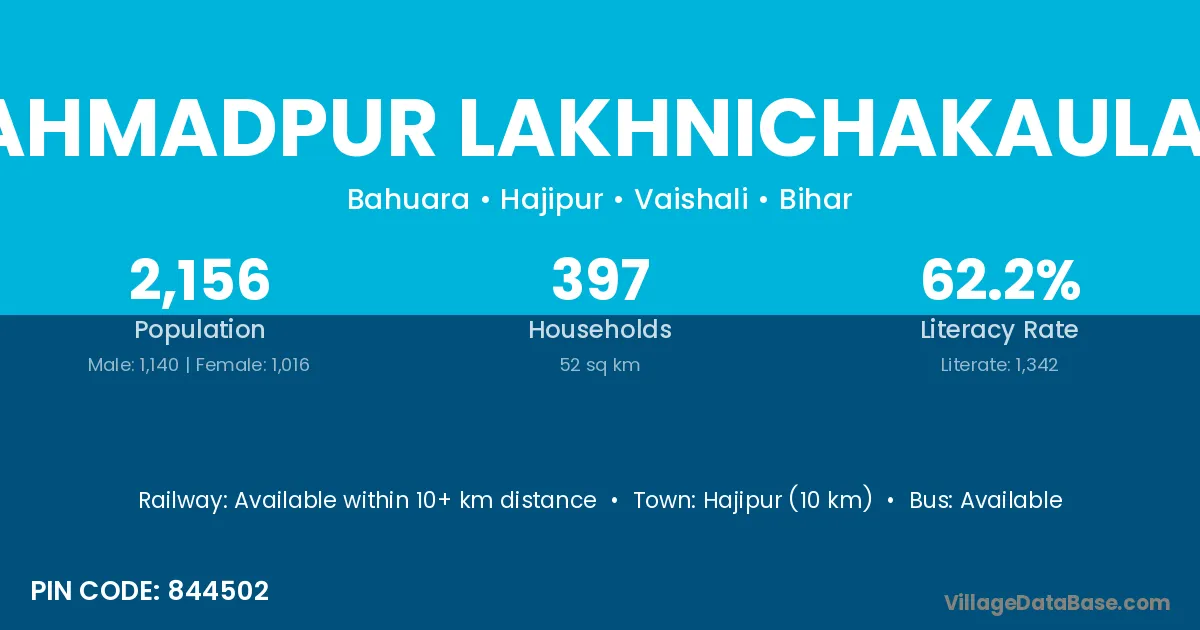 Ahmadpur Lakhnichakaulai village has a total population of 2,156 people, of which 1,140 are males and 1,016 are females.