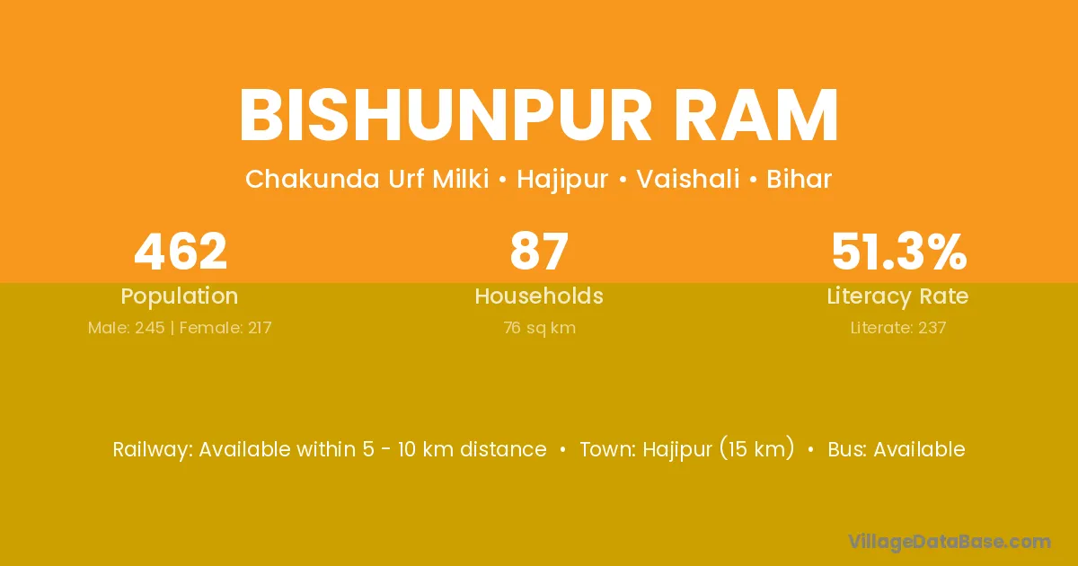 Hajipur (15 km) is the nearest town to Bishunpur Ram village for major economic activities and is located approximately 15 km away.