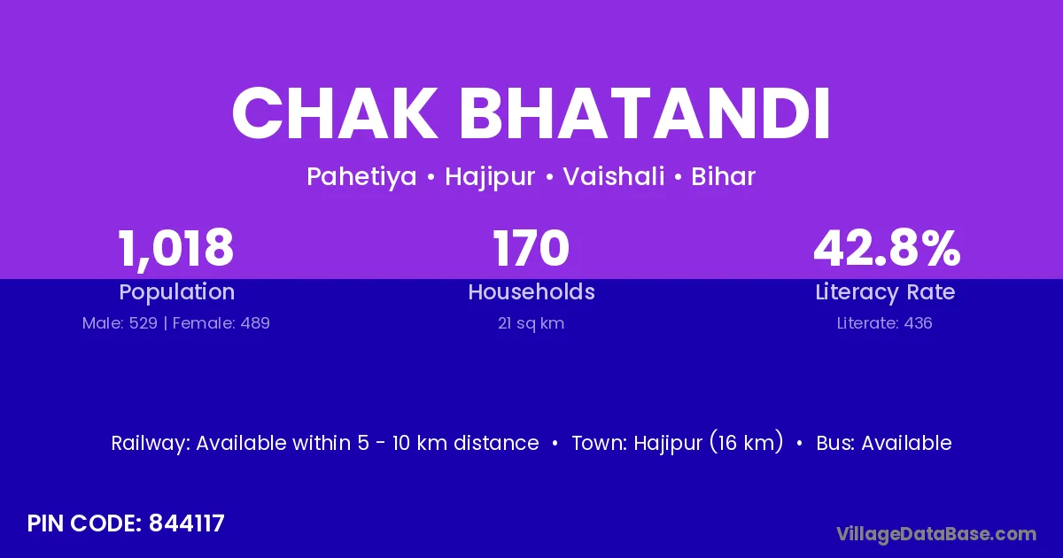 Hajipur (16 km) is the nearest town to Chak Bhatandi village for major economic activities and is located approximately 16 km away.