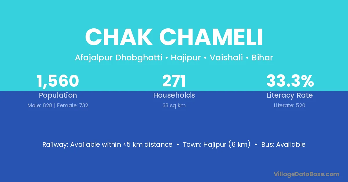 Hajipur (6 km) is the nearest town to Chak Chameli village for major economic activities and is located approximately 6 km away.