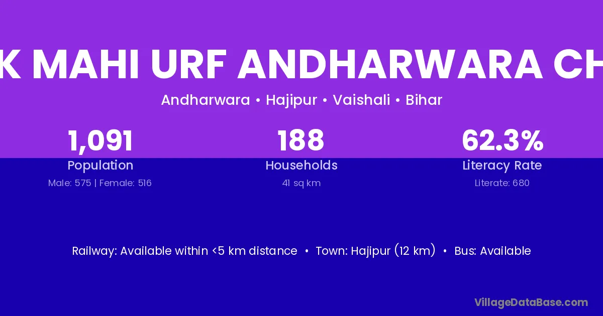 Hajipur (12 km) is the nearest town to Chak Mahi Urf Andharwara Chauk village for major economic activities and is located approximately 12 km away.