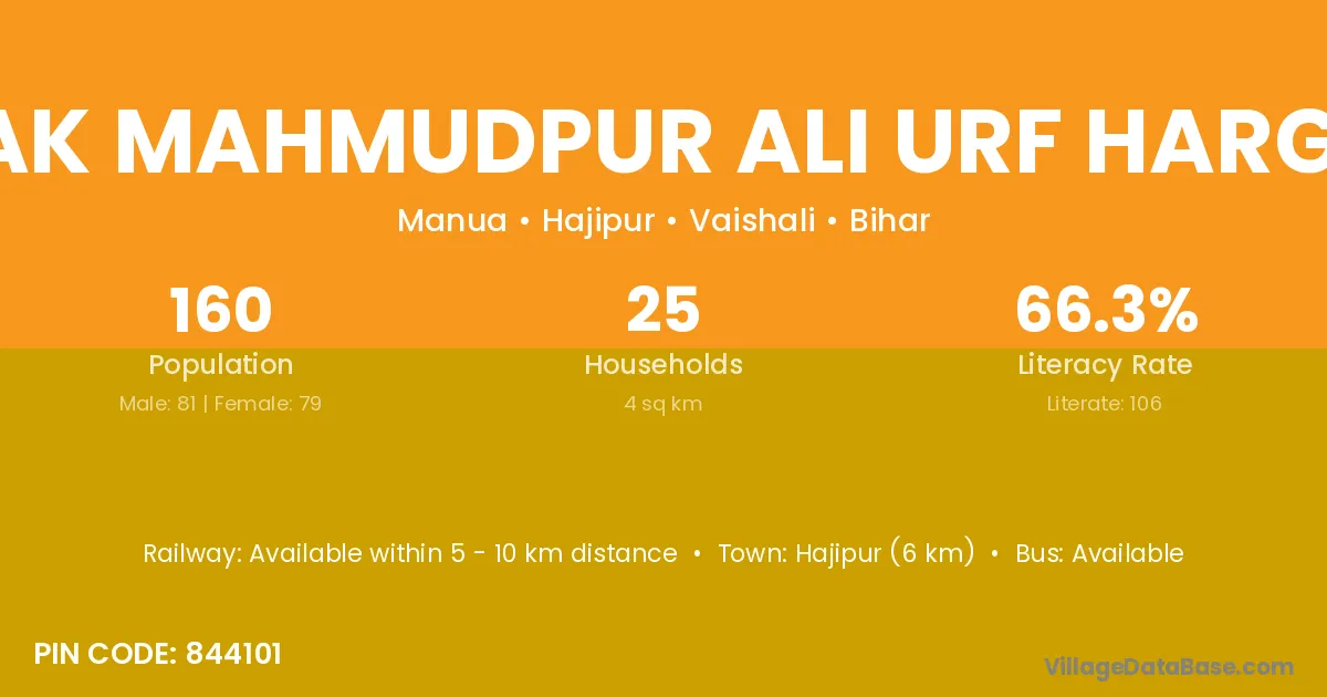 Hajipur (6 km) is the nearest town to Chak Mahmudpur Ali Urf Hargobi village for major economic activities and is located approximately 6 km away.