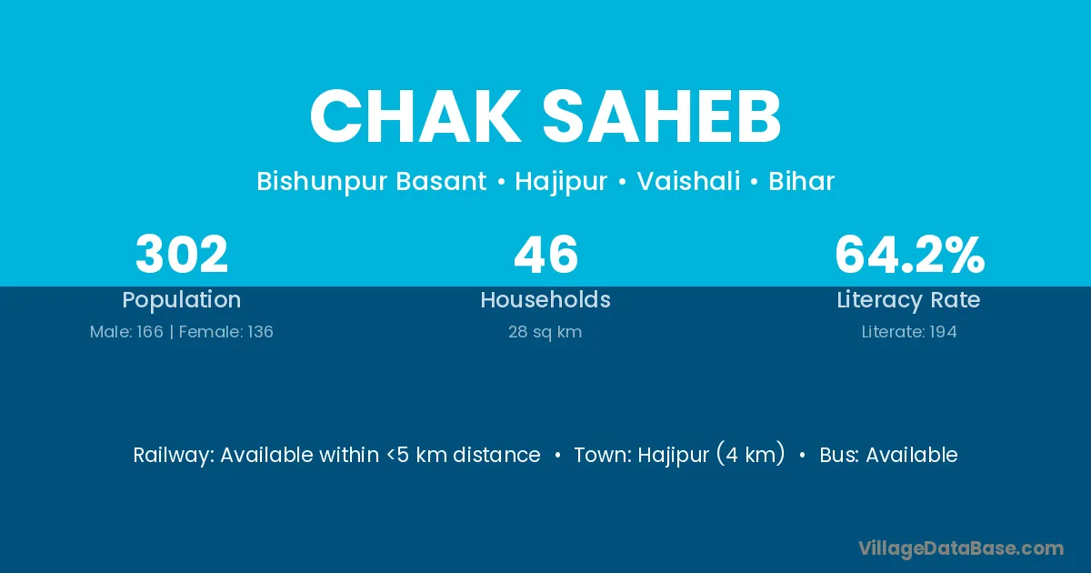 Hajipur (4 km) is the nearest town to Chak Saheb village for major economic activities and is located approximately 4 km away.