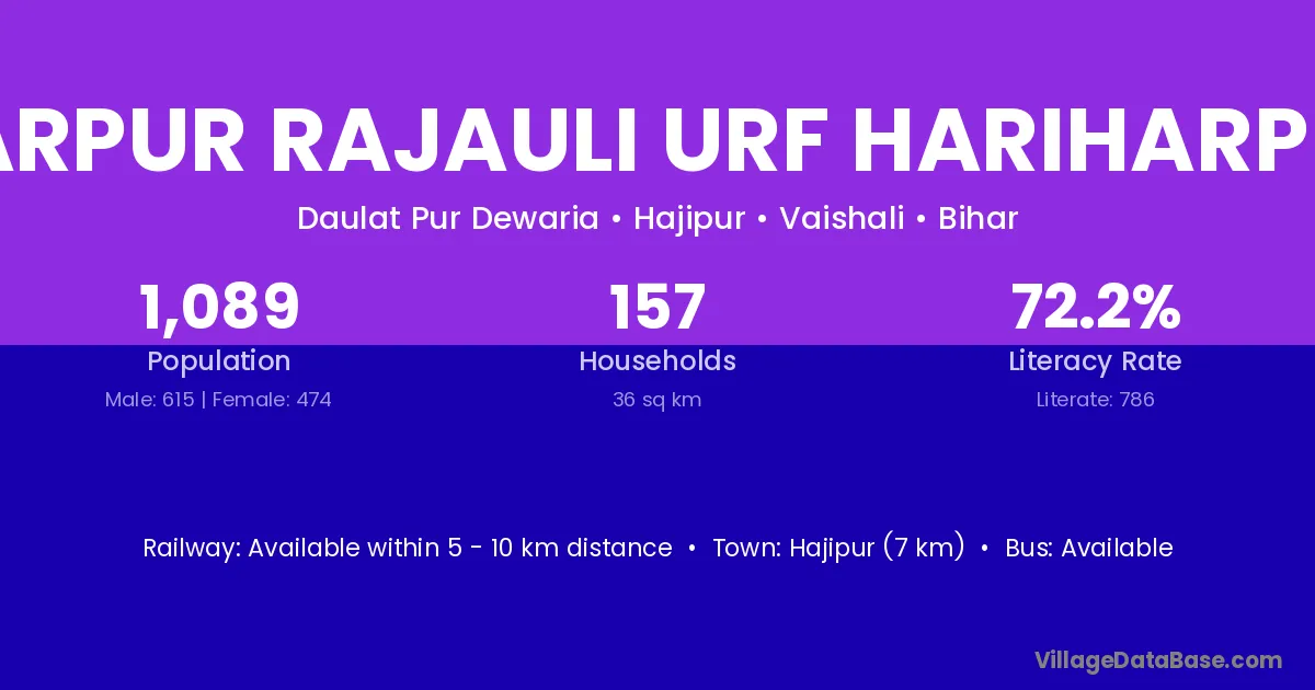 Harpur Rajauli Urf Hariharpur village has a total population of 1,089 people, of which 615 are males and 474 are females.