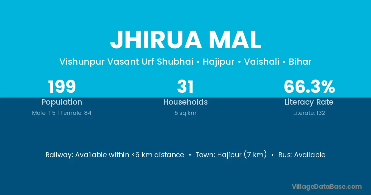 Hajipur (7 km) is the nearest town to Jhirua Mal village for major economic activities and is located approximately 7 km away.