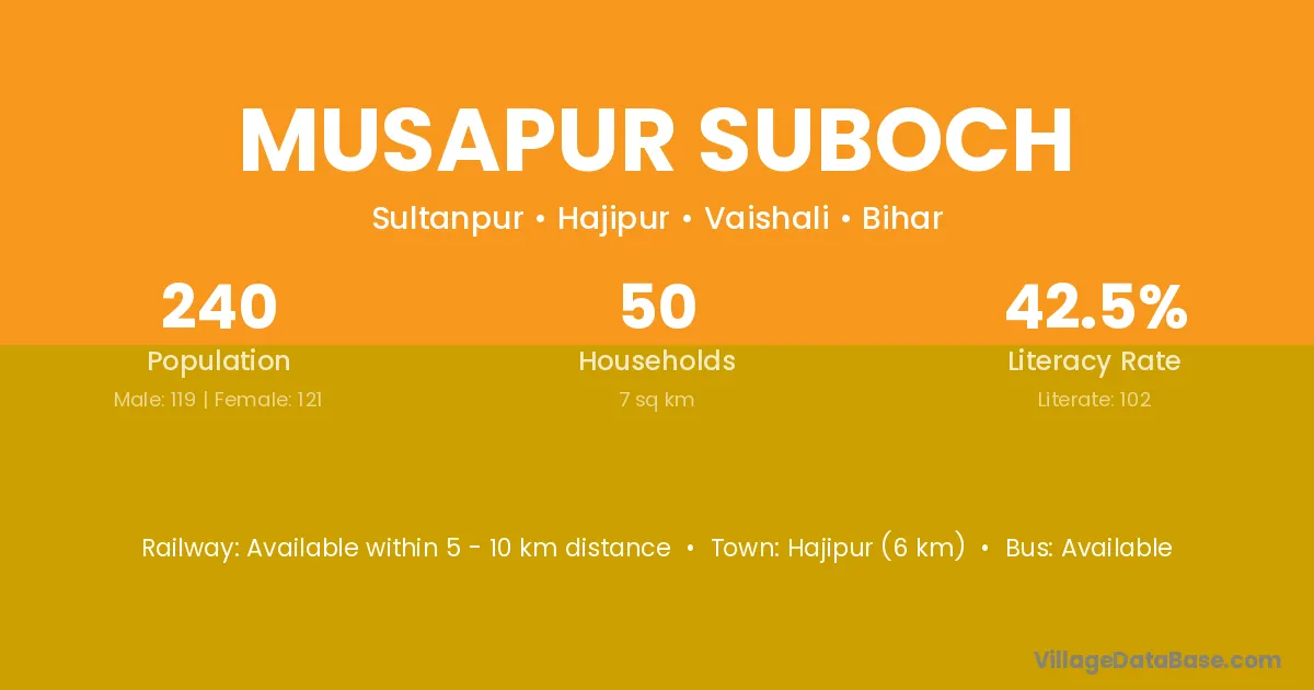 Hajipur (6 km) is the nearest town to Musapur Suboch village for major economic activities and is located approximately 6 km away.