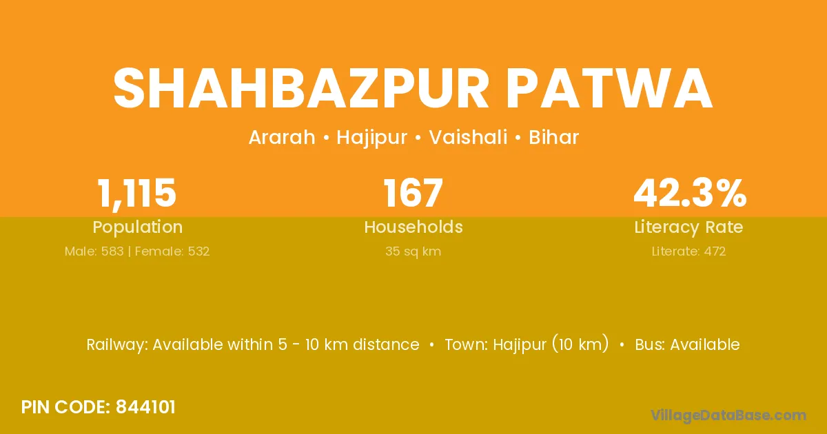 Hajipur (10 km) is the nearest town to Shahbazpur Patwa village for major economic activities and is located approximately 10 km away.