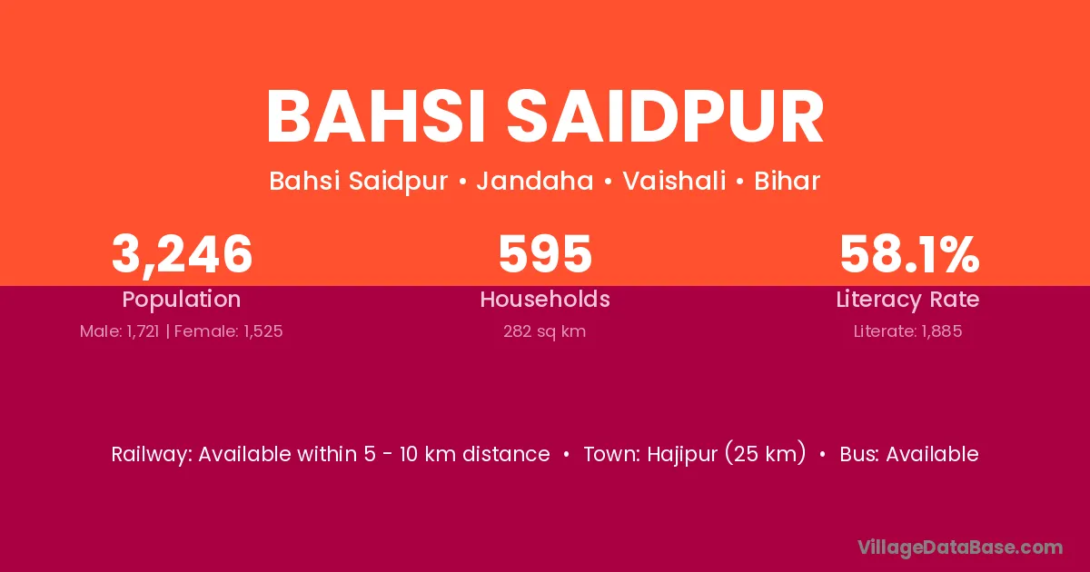 Hajipur (25 km) is the nearest town to Bahsi Saidpur village for major economic activities and is located approximately 25 km away.
