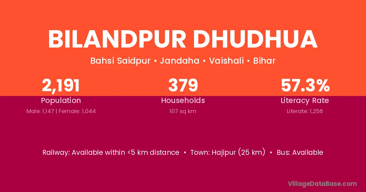 Hajipur (25 km) is the nearest town to Bilandpur Dhudhua village for major economic activities and is located approximately 25 km away.