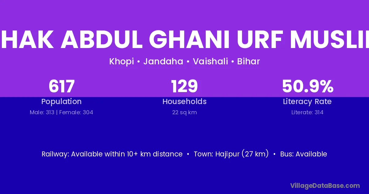 Hajipur (27 km) is the nearest town to Chak Abdul Ghani Urf Muslim village for major economic activities and is located approximately 27 km away.