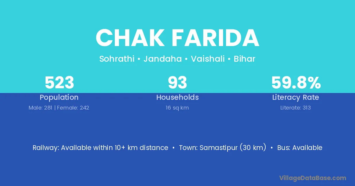 Samastipur (30 km) is the nearest town to Chak Farida village for major economic activities and is located approximately 30 km away.