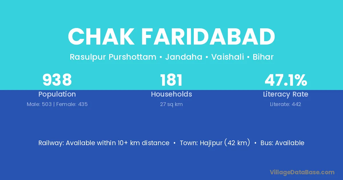 Hajipur (42 km) is the nearest town to Chak Faridabad village for major economic activities and is located approximately 42 km away.