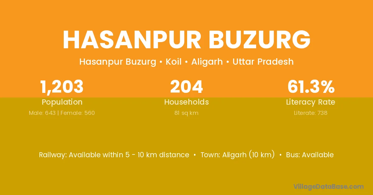 The literacy rate of Hasanpur Buzurg village is 55.97%. Male literacy stands at 64.73% and female literacy at 45.70%.