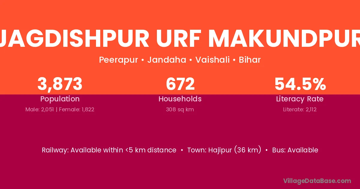 Hajipur (36 km) is the nearest town to Jagdishpur Urf Makundpur village for major economic activities and is located approximately 36 km away.