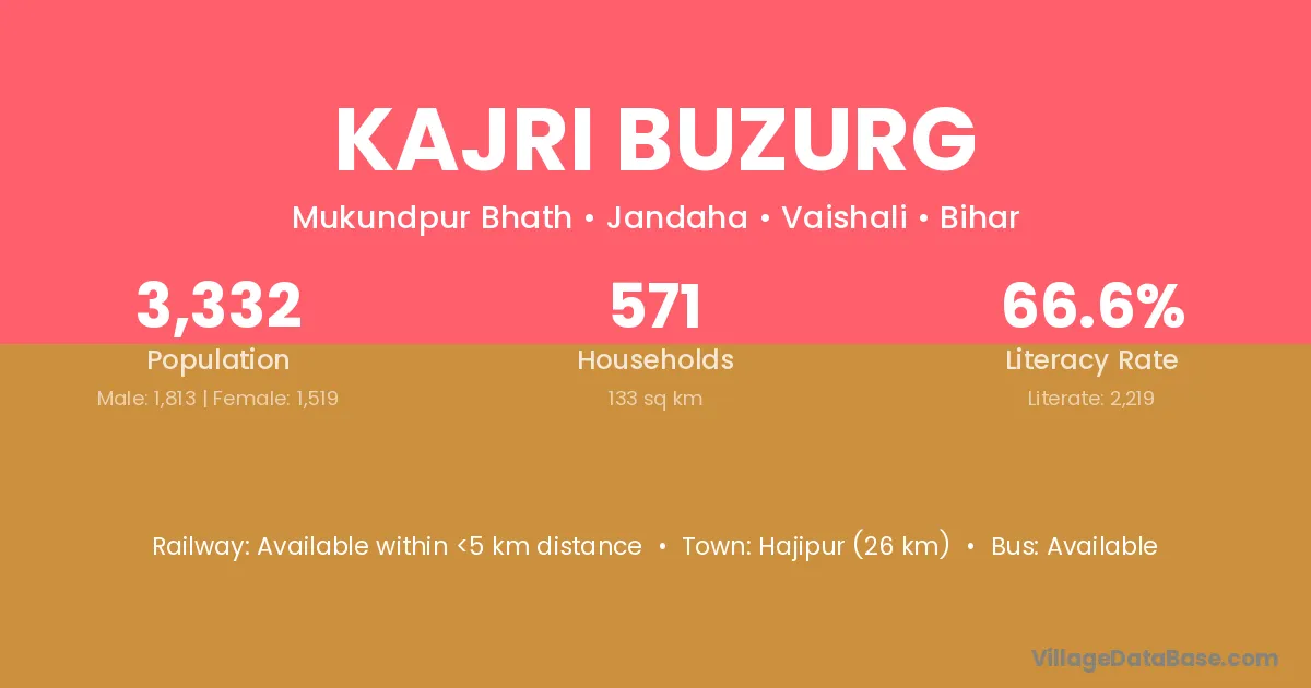 Hajipur (26 km) is the nearest town to Kajri Buzurg village for major economic activities and is located approximately 26 km away.