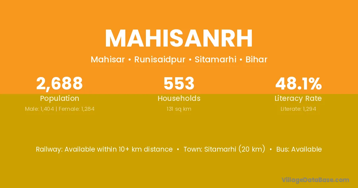 Samastipur (23 km) is the nearest town to Mahisanrh village for major economic activities and is located approximately 23 km away.