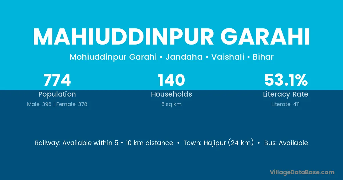 Hajipur (24 km) is the nearest town to Mahiuddinpur Garahi village for major economic activities and is located approximately 24 km away.