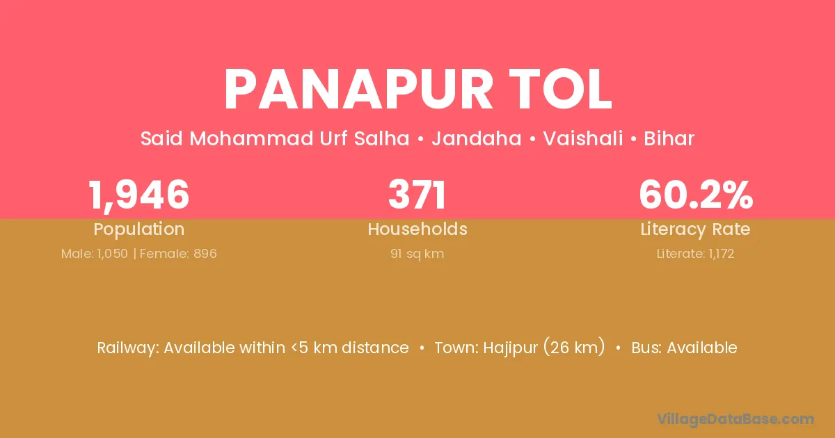 Hajipur (26 km) is the nearest town to Panapur Tol village for major economic activities and is located approximately 26 km away.