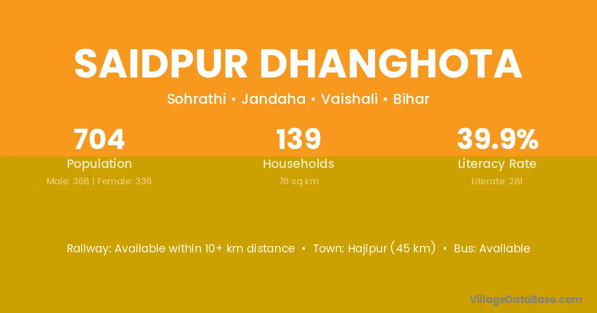 Hajipur (45 km) is the nearest town to Saidpur Dhanghota village for major economic activities and is located approximately 45 km away.