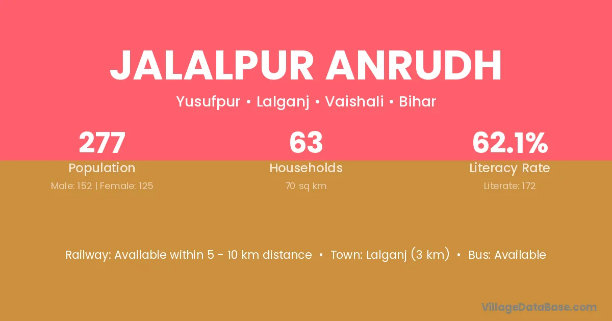 Lalganj (3 km) is the nearest town to Jalalpur Anrudh village for major economic activities and is located approximately 3 km away.