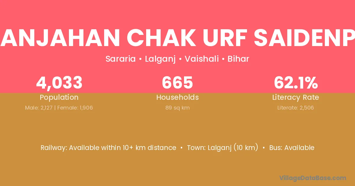 Khanjahan Chak Urf Saidenpur village has a total population of 4,033 people, of which 2,127 are males and 1,906 are females.