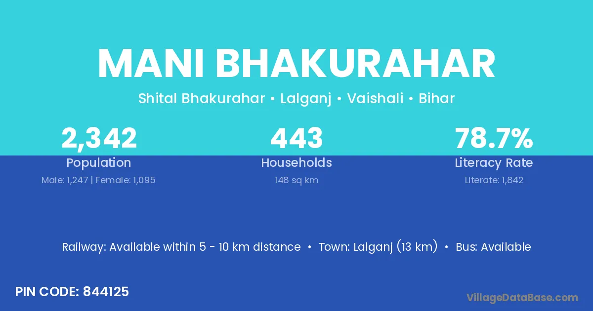 Lalganj (13 km) is the nearest town to Mani Bhakurahar village for major economic activities and is located approximately 13 km away.