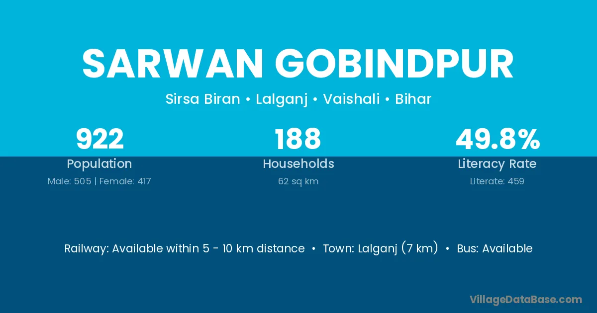 Sarwan Gobindpur village has a total population of 922 people, of which 505 are males and 417 are females.
