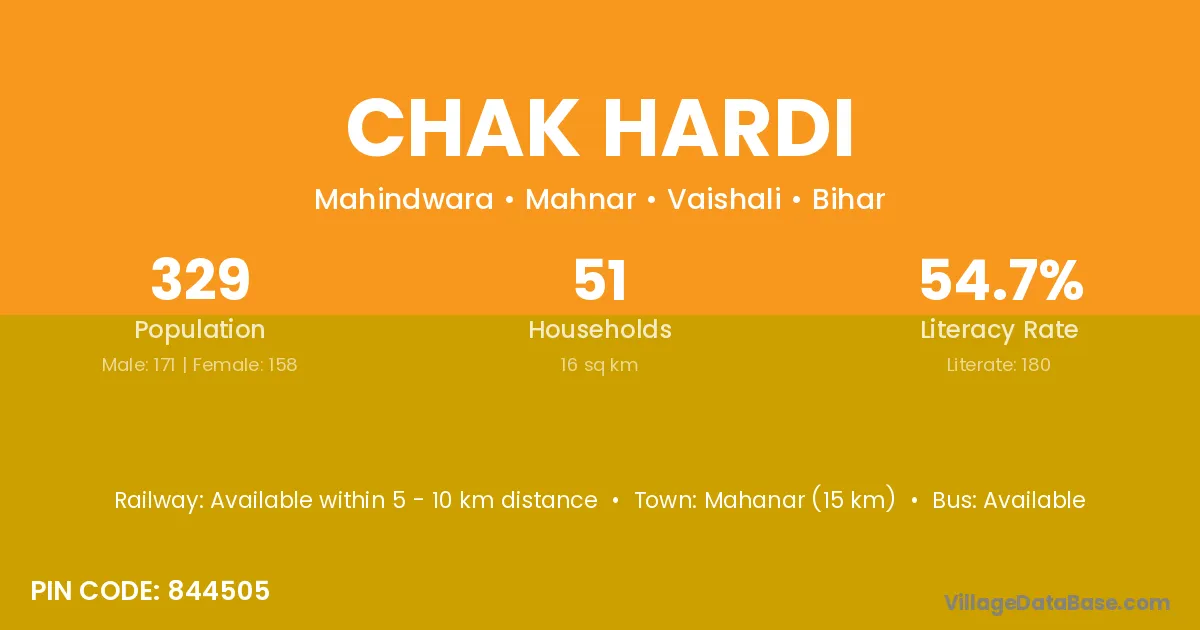 Mahanar (15 km) is the nearest town to Chak Hardi village for major economic activities and is located approximately 15 km away.