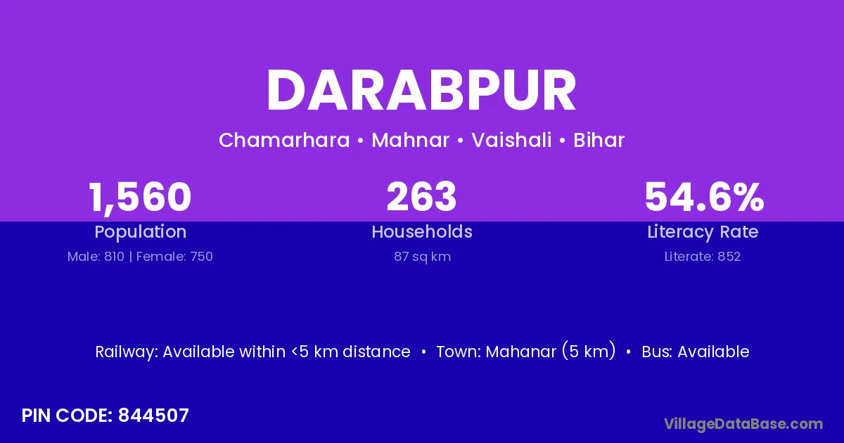 Mahanar (5 km) is the nearest town to Darabpur village for major economic activities and is located approximately 5 km away.