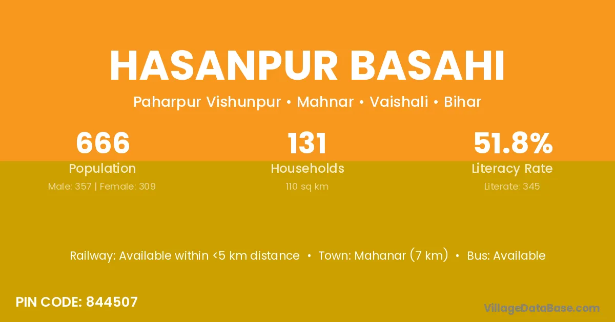 Hasanpur Basahi village has a total population of 666 people, of which 357 are males and 309 are females.