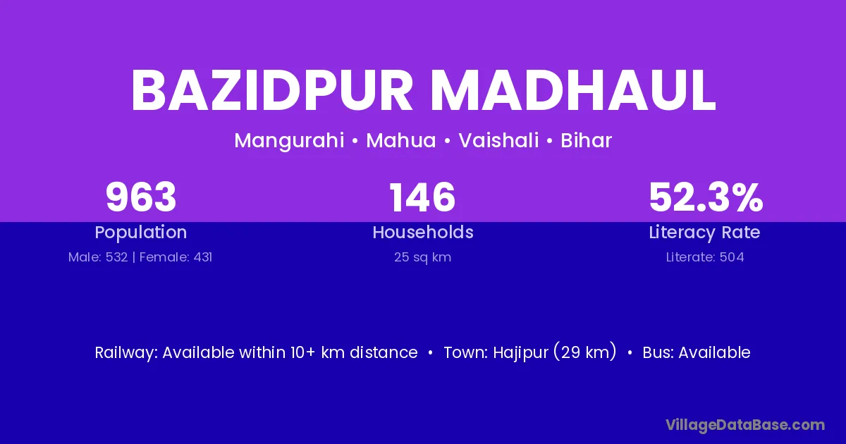 Bazidpur Madhaul village has a total population of 963 people, of which 532 are males and 431 are females.