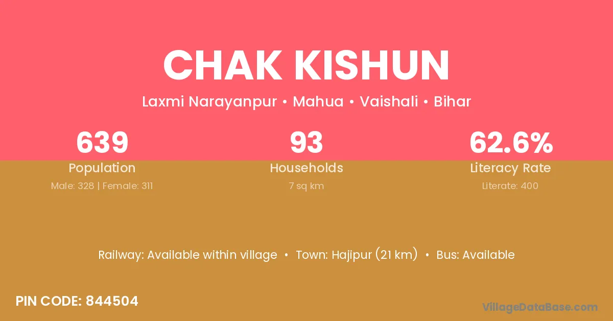 Hajipur (21 km) is the nearest town to Chak Kishun village for major economic activities and is located approximately 21 km away.