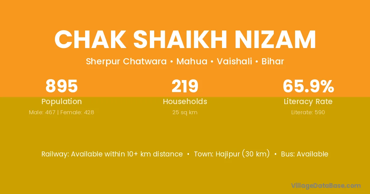 Hajipur (30 km) is the nearest town to Chak Shaikh Nizam village for major economic activities and is located approximately 30 km away.