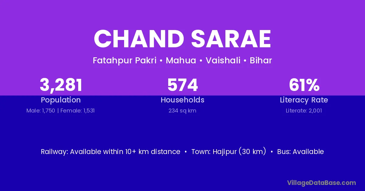 Hajipur (30 km) is the nearest town to Chand Sarae village for major economic activities and is located approximately 30 km away.