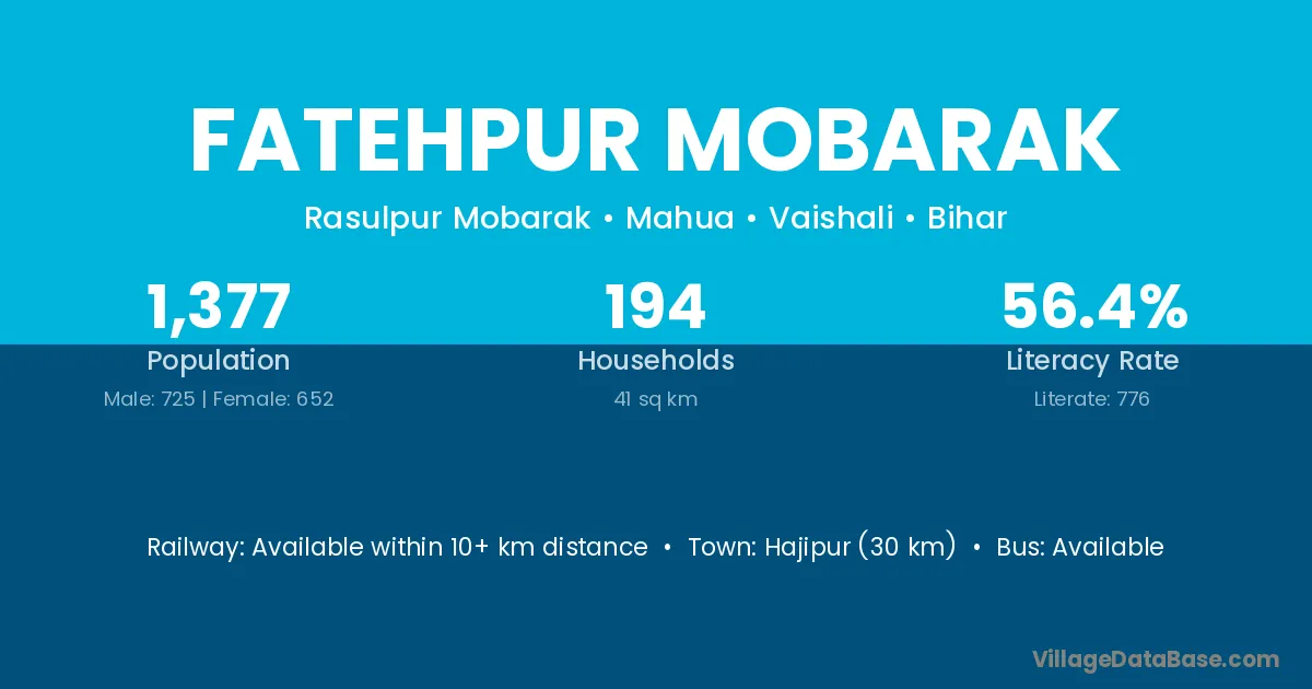 Hajipur (30 km) is the nearest town to Fatehpur Mobarak village for major economic activities and is located approximately 30 km away.