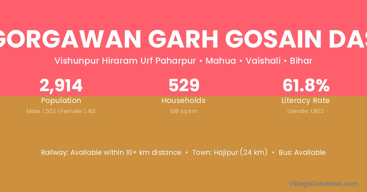 Hajipur (24 km) is the nearest town to Gorgawan Garh Gosain Das village for major economic activities and is located approximately 24 km away.