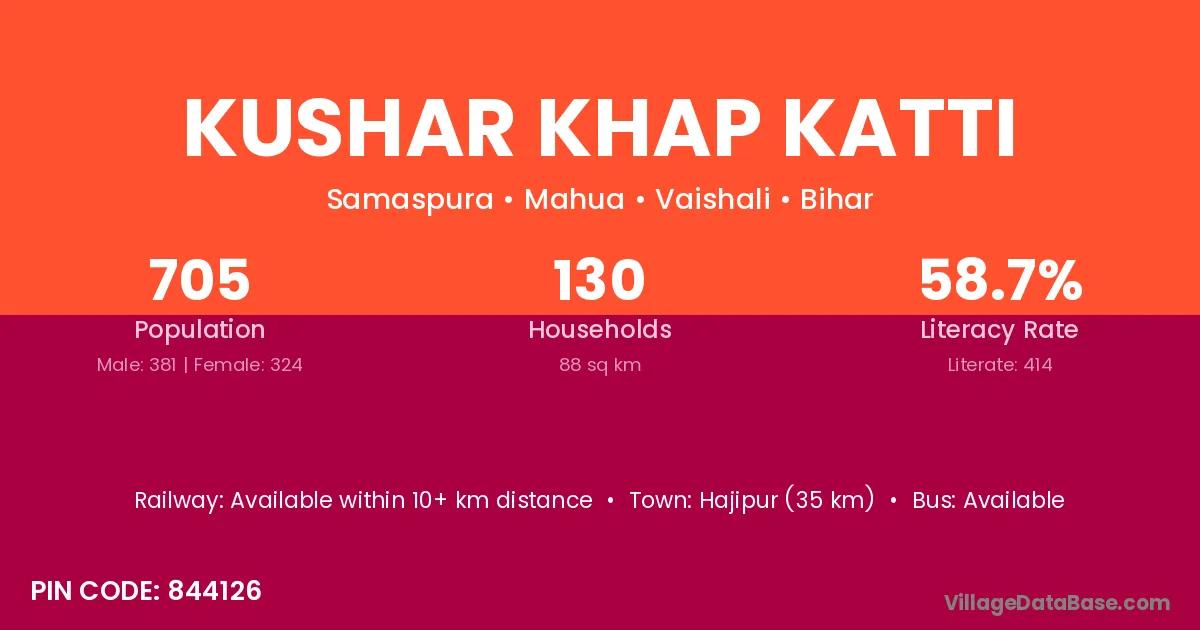 Hajipur (35 km) is the nearest town to Kushar Khap Katti village for major economic activities and is located approximately 35 km away.