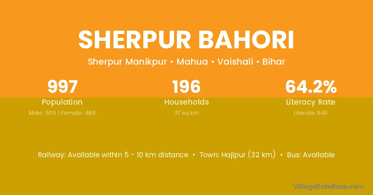 Hajipur (32 km) is the nearest town to Sherpur Bahori village for major economic activities and is located approximately 32 km away.