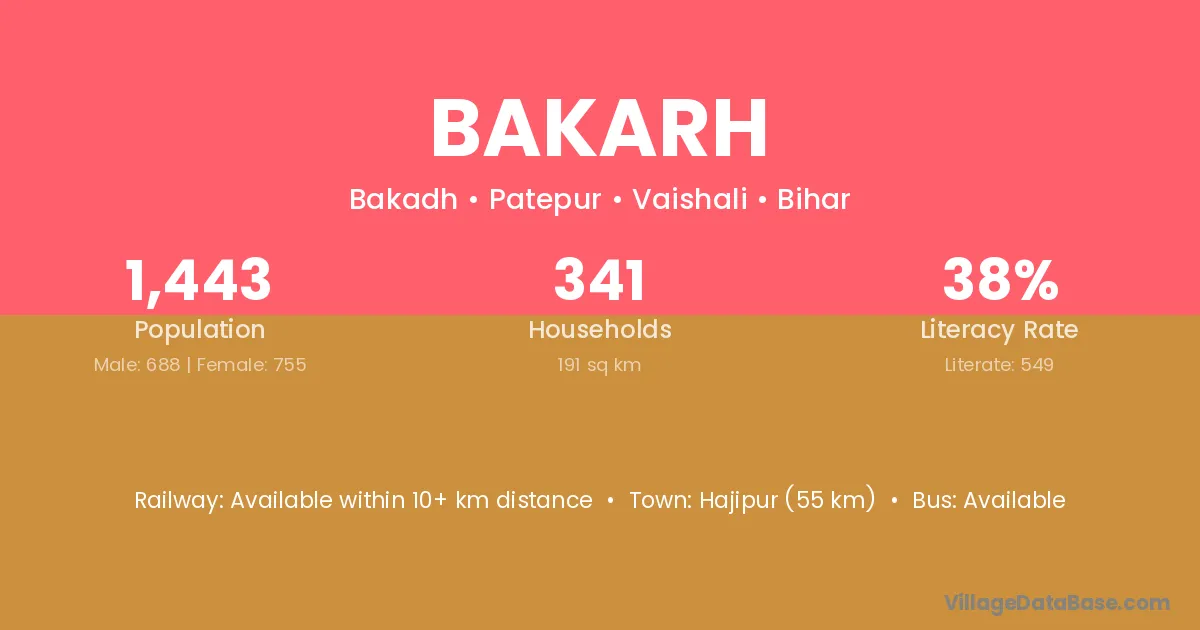 Hajipur (55 km) is the nearest town to Bakarh village for major economic activities and is located approximately 55 km away.