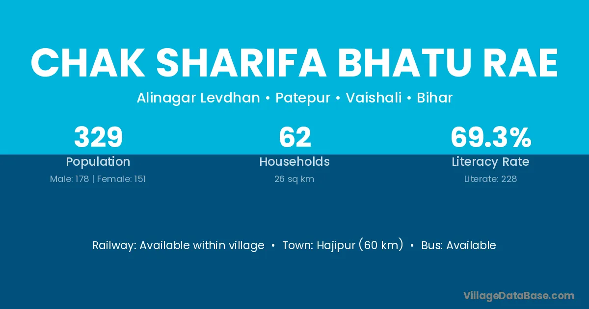 Hajipur (60 km) is the nearest town to Chak Sharifa Bhatu Rae village for major economic activities and is located approximately 60 km away.