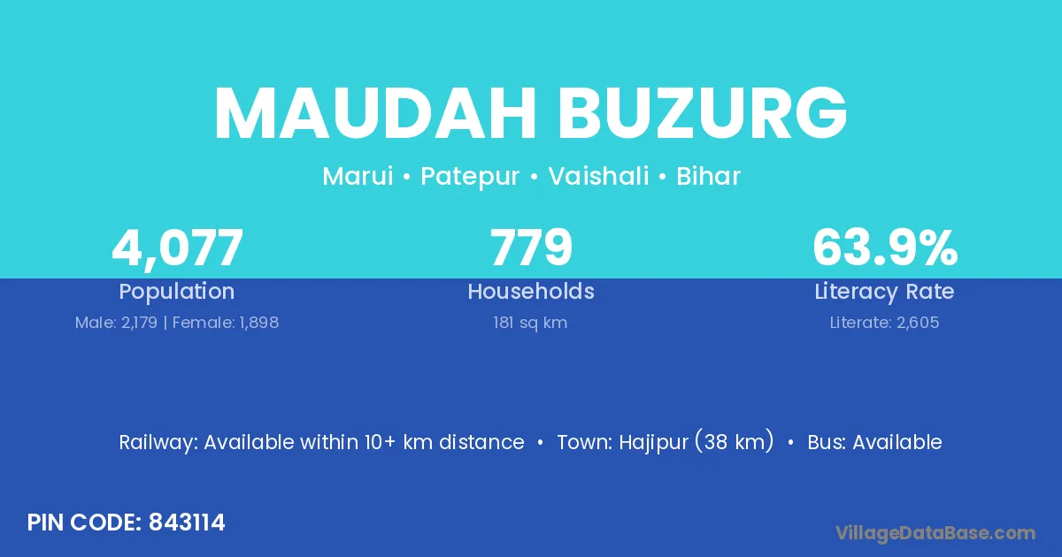 Hajipur (38 km) is the nearest town to Maudah Buzurg village for major economic activities and is located approximately 38 km away.
