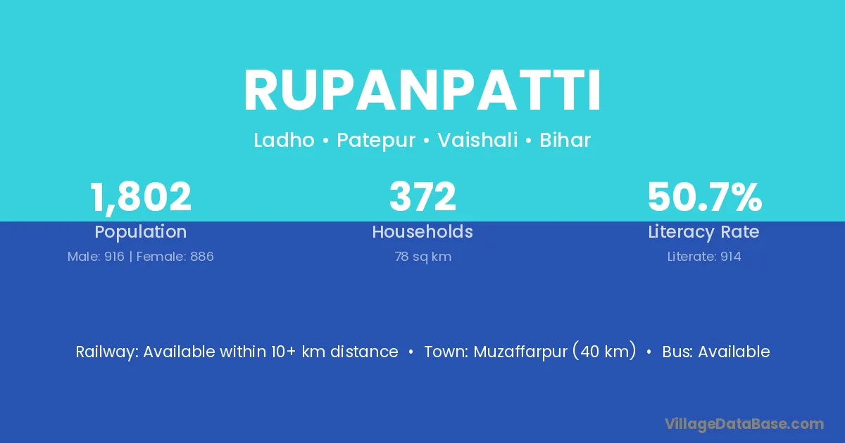 Muzaffarpur (40 km) is the nearest town to Rupanpatti village for major economic activities and is located approximately 40 km away.