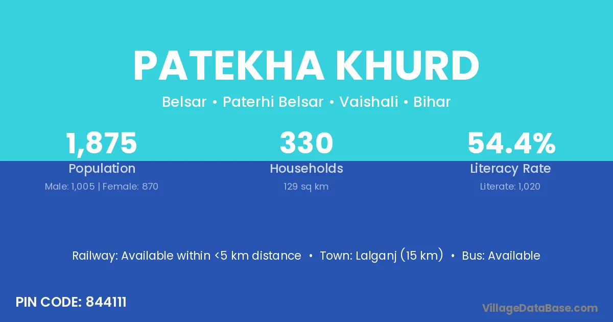 Lalganj (15 km) is the nearest town to Patekha Khurd village for major economic activities and is located approximately 15 km away.