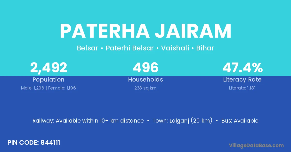 Lalganj (20 km) is the nearest town to Paterha Jairam village for major economic activities and is located approximately 20 km away.